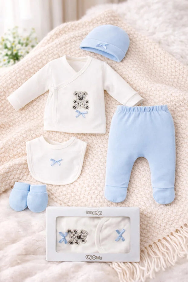 Kutulu 5 Parça Hastane Çıkışı Seti (Ayıcık – 3 Ay), yenidoğan/0-3 ay döneminde bebeğin temel ihtiyaçlarını tek sette toplar. Ayıcık temasıyla sevimli bir görünüm sağlar. Kutu ambalajı sayesinde hem düzenli saklama hem de hediye seçeneği olarak idealdir. % 100 Pamuk